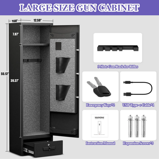 Biometric Fingerprint Gun Safe with Removable Shelf and 3 Magnetic Gun Slots, 10-12 Unassembled Large Gun Safe for Rifles and Pistols, Gun Cabinet with Magnetic Induction Light and Storage Bag