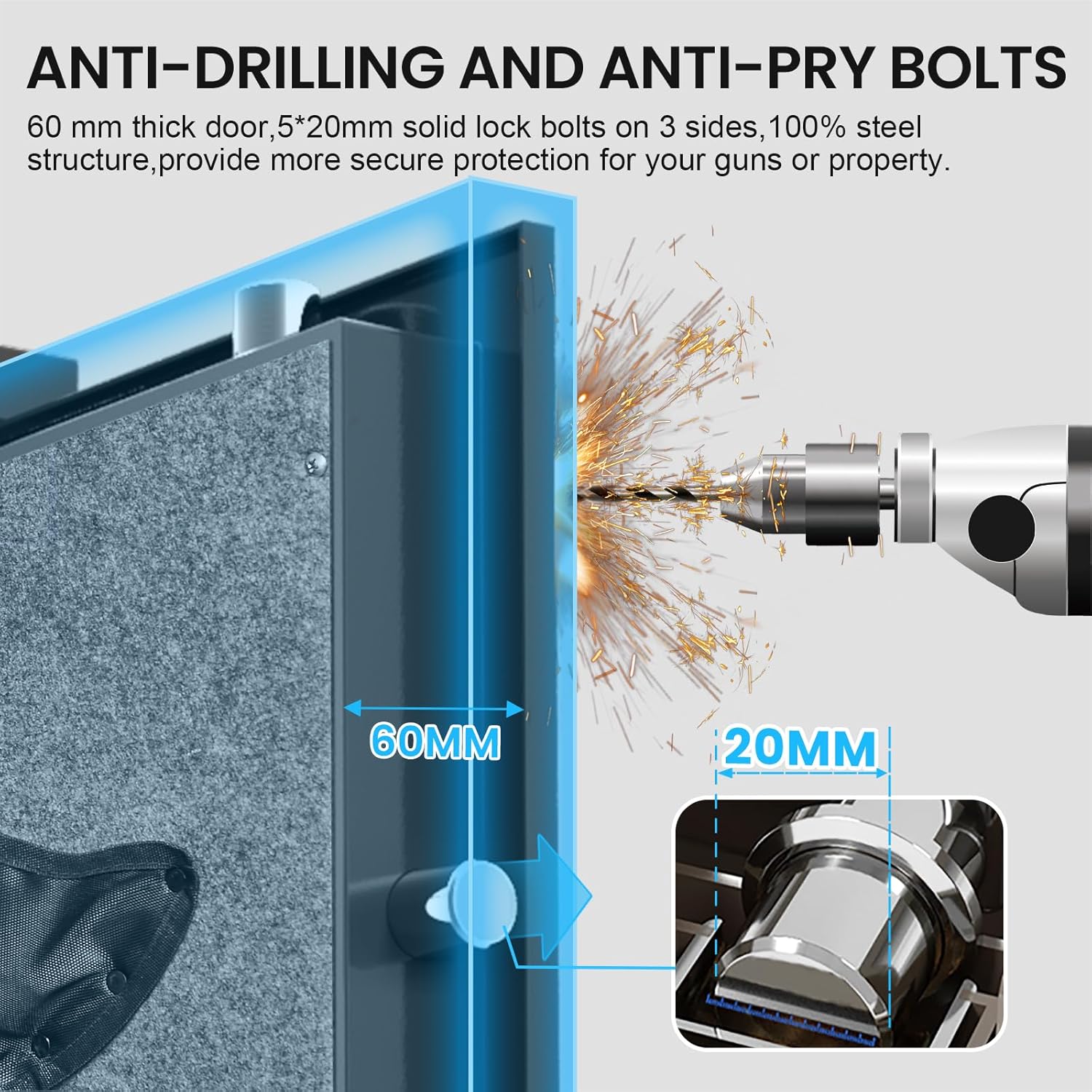 【High-Quality Gun Safe】We prioritize customer safety, so safety is the top consideration in designing safes. Our gun safe is made of high-quality steel. In addition to the three locking bolts on the door's side, there is also one locking bolt on the top and bottom of the door, providing all-around protection for the gun safe. This prevents it from being improperly knocked or pried open by thieves, keeping your family safe from danger.
