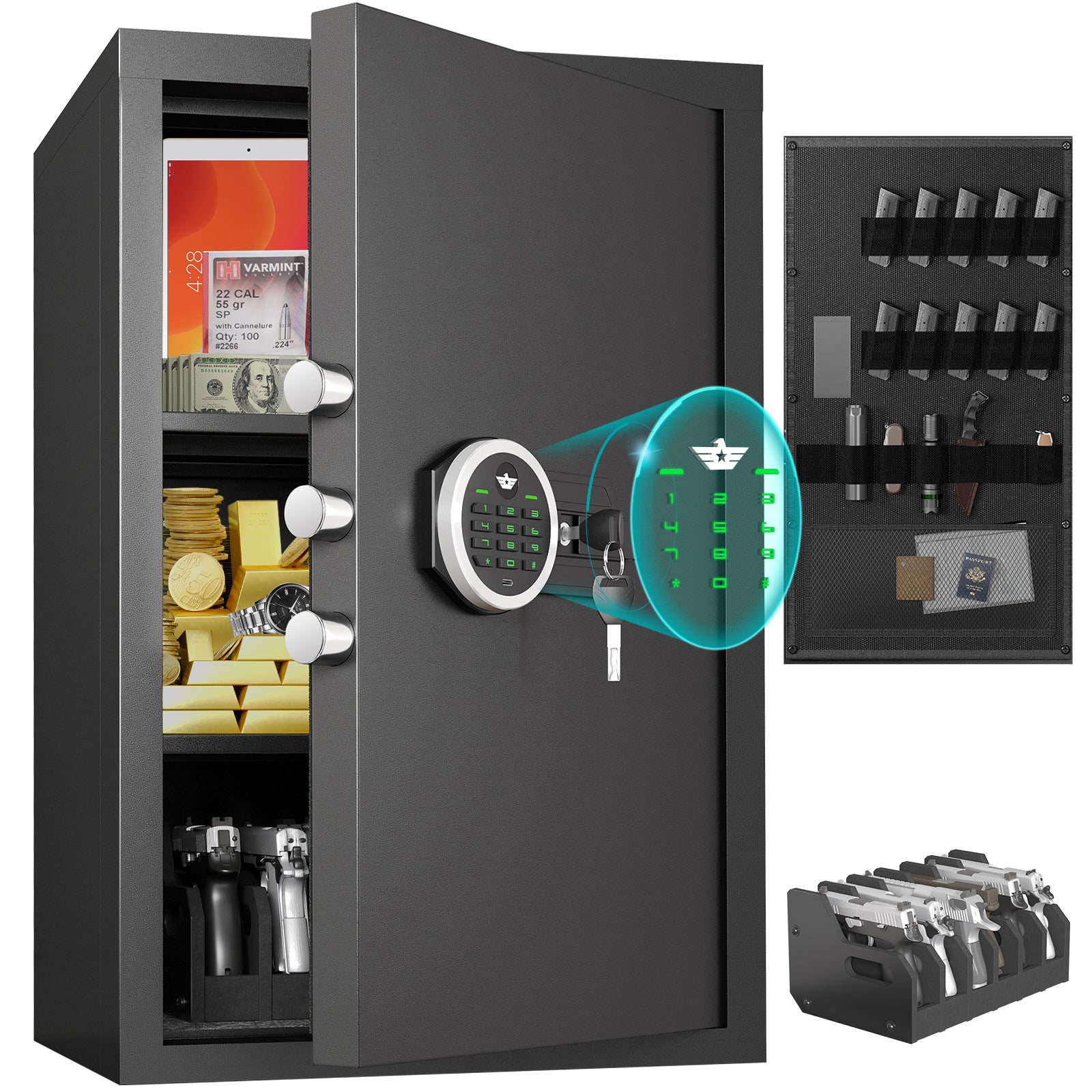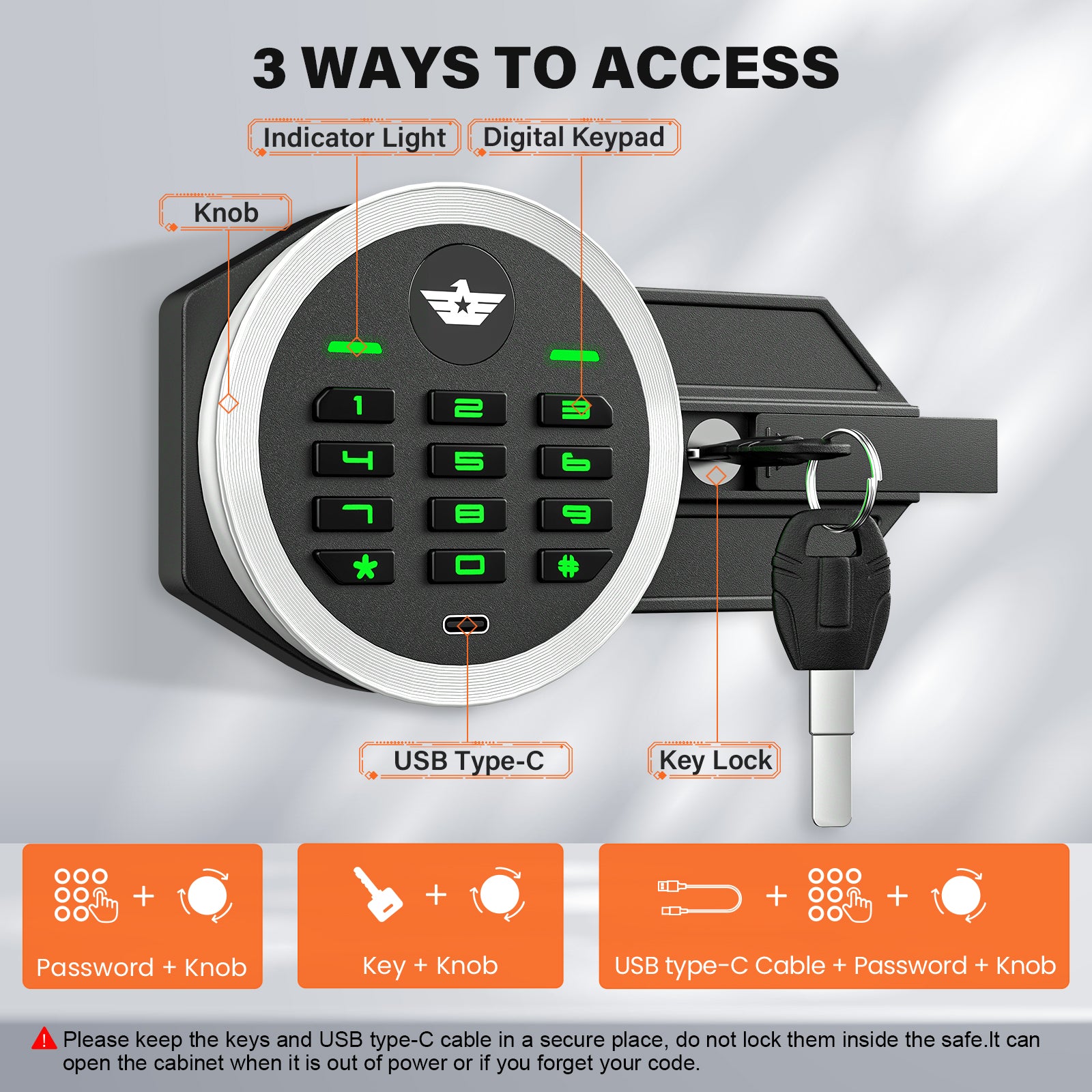 - 【Three Unlocking Methods】Three ways to open safe: ① Password + Knob (daily use) ② Key + Knob (forget the password) ③ USB type-c + Password + Knob (battery runs out). Please keep the keys and USB type in a secure place, do not lock them inside the safe, it can open the cabinet when it is out of power or if you forget your password.