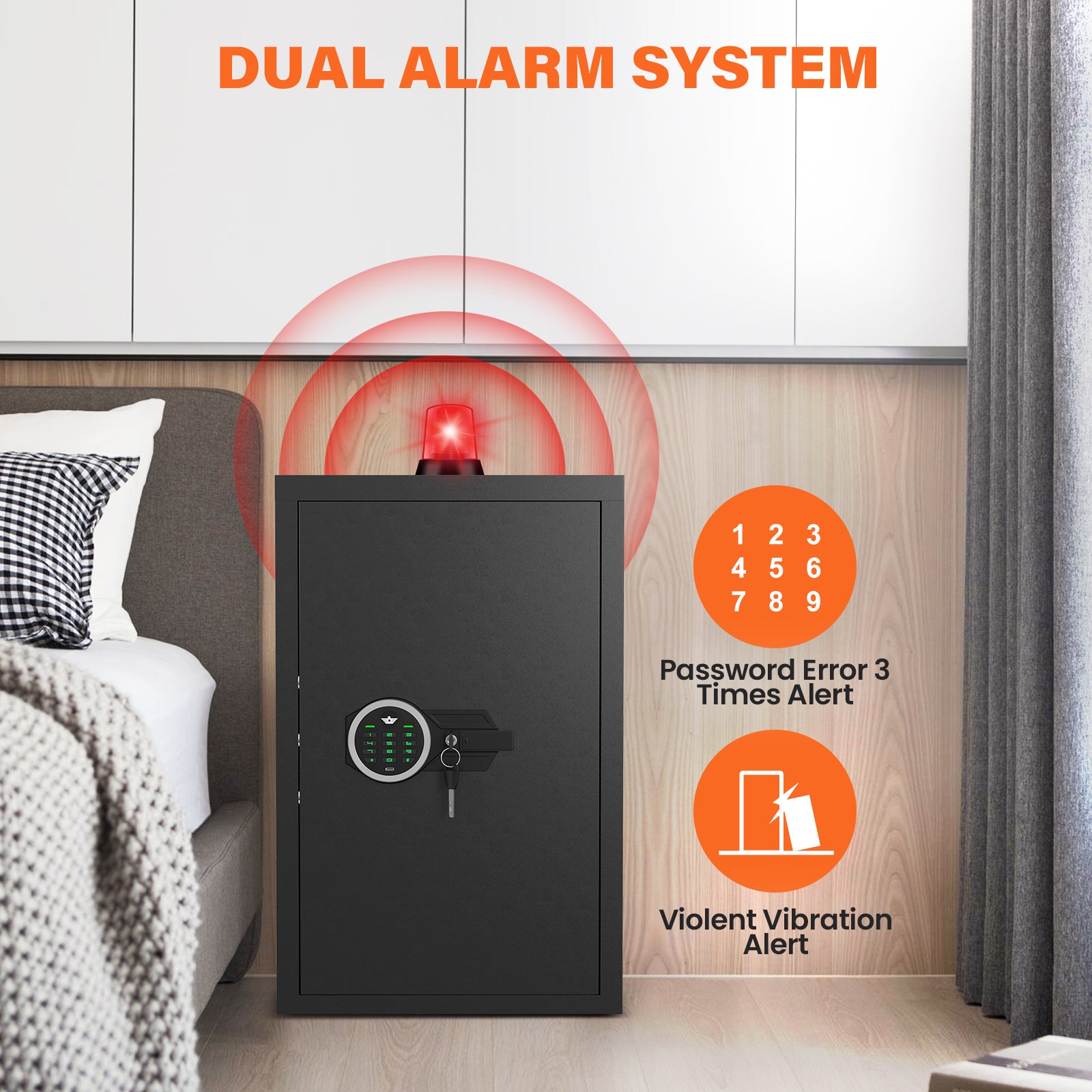 - 【Dual Alarm and Mute Function】The large safe has a dual alarm system that activates after 3 consecutive incorrect passwords or violent vibrations, with a 70 decibel alarm sound lasting 30 seconds, audible throughout your home. The alarm can be stopped by entering the correct password. Unlike other safes, you can also turn on the mute function to keep the safe silent if you prefer.