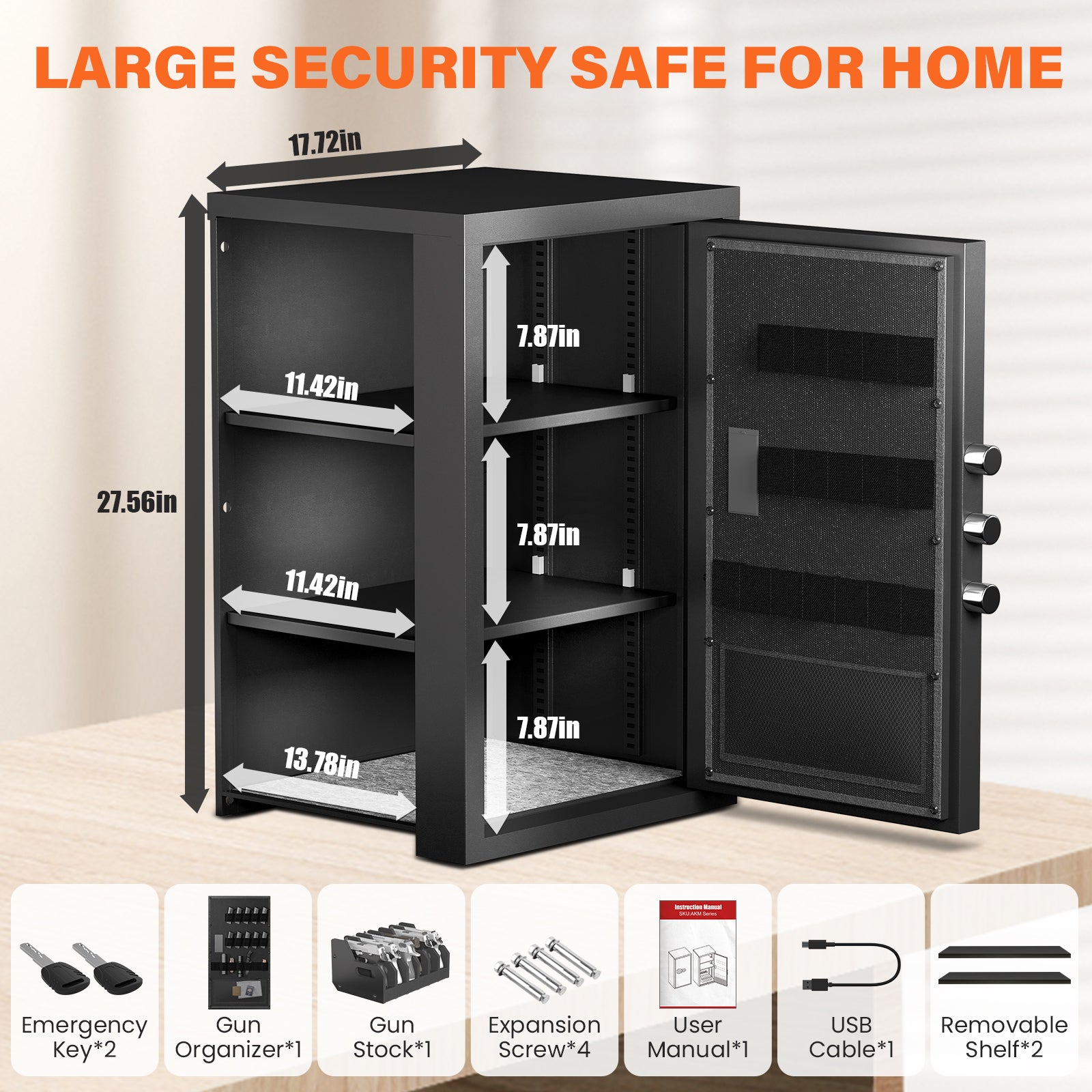 【Extra Large Safe Box for Home】Our safe box has a spacious capacity of 6.0 cubic feet. External dimensions: 15.75"D x 17.71"W x 27.56"H, internal dimensions: 15.47"D x 17.32"W x 26.38"H. The large interior space is perfect for storing jewelry, documents, short guns, and other valuables. We also equipped with the adjustable and removable shelves that can easily adjust to satisfy your different storage needs.