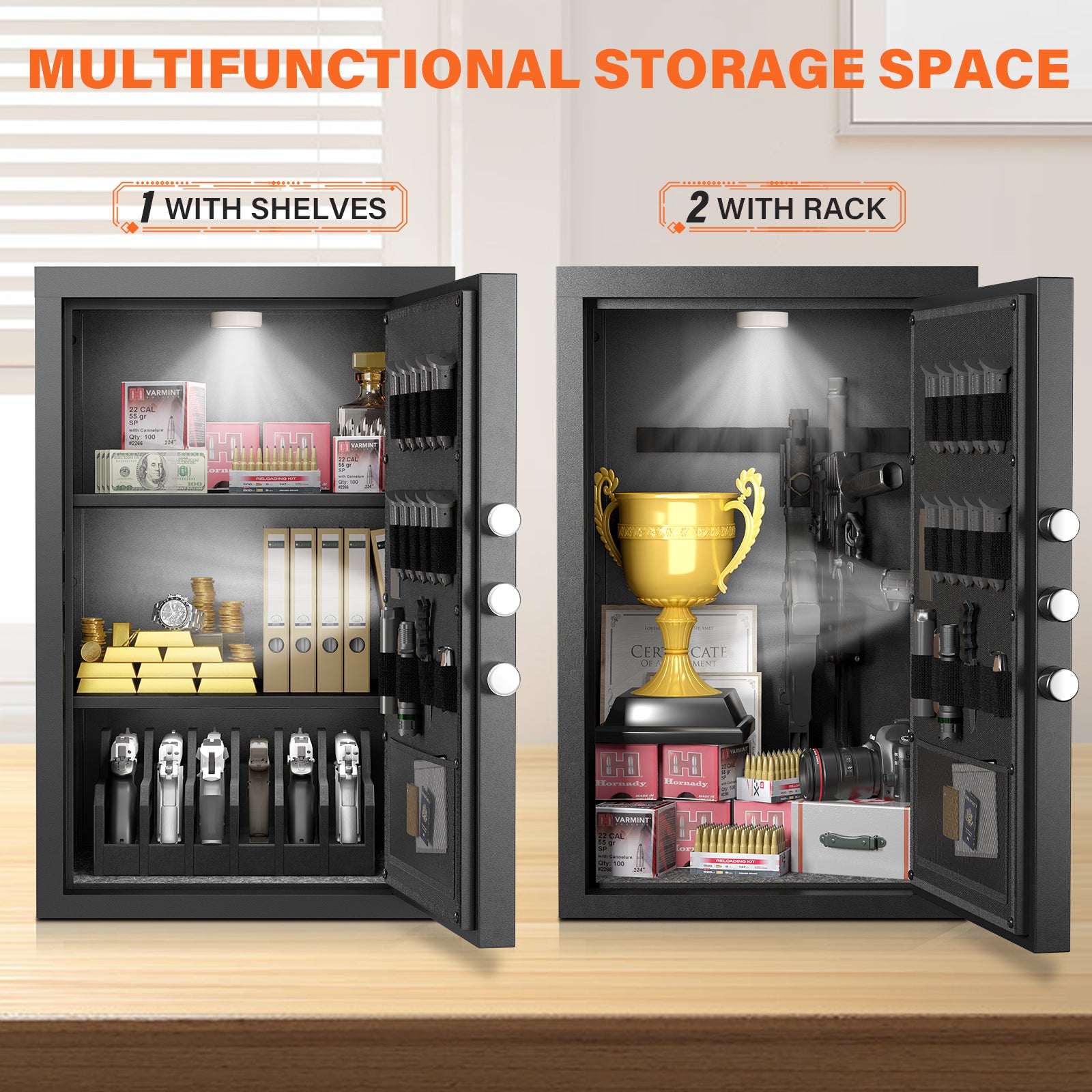 - 【Backlit Keypad & LED Light】Riflewell 6.0 Cu ft safe box equipped with backlight keypad, let you easily see and operate the password clearly in the dark. When you open the safe with password, the led light will on automatically, you can quickly find what you want. Moreover, we also add a magnetic LED light for more convenience.
