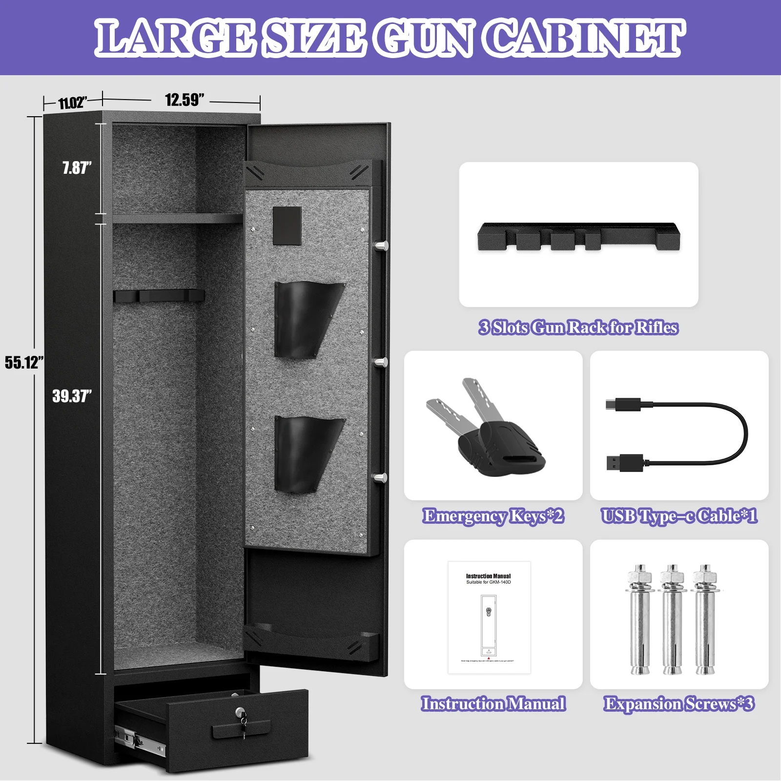 - 【Complete Accessories & 24/7 Customer Service】1 x Rifle Security Lock, 2 x Emergency Key, 5 x Expansion Screws, 1 x Type-C Cable, 1 x Gun Mount, 1 Instruction Manual. If there are any problems with the gun cabinet, please let us know directly, and our experienced customer service team will reply and solve your problem within 24 hours! If your key is lost and you are unable to open your safe, we will provide a key matching service.