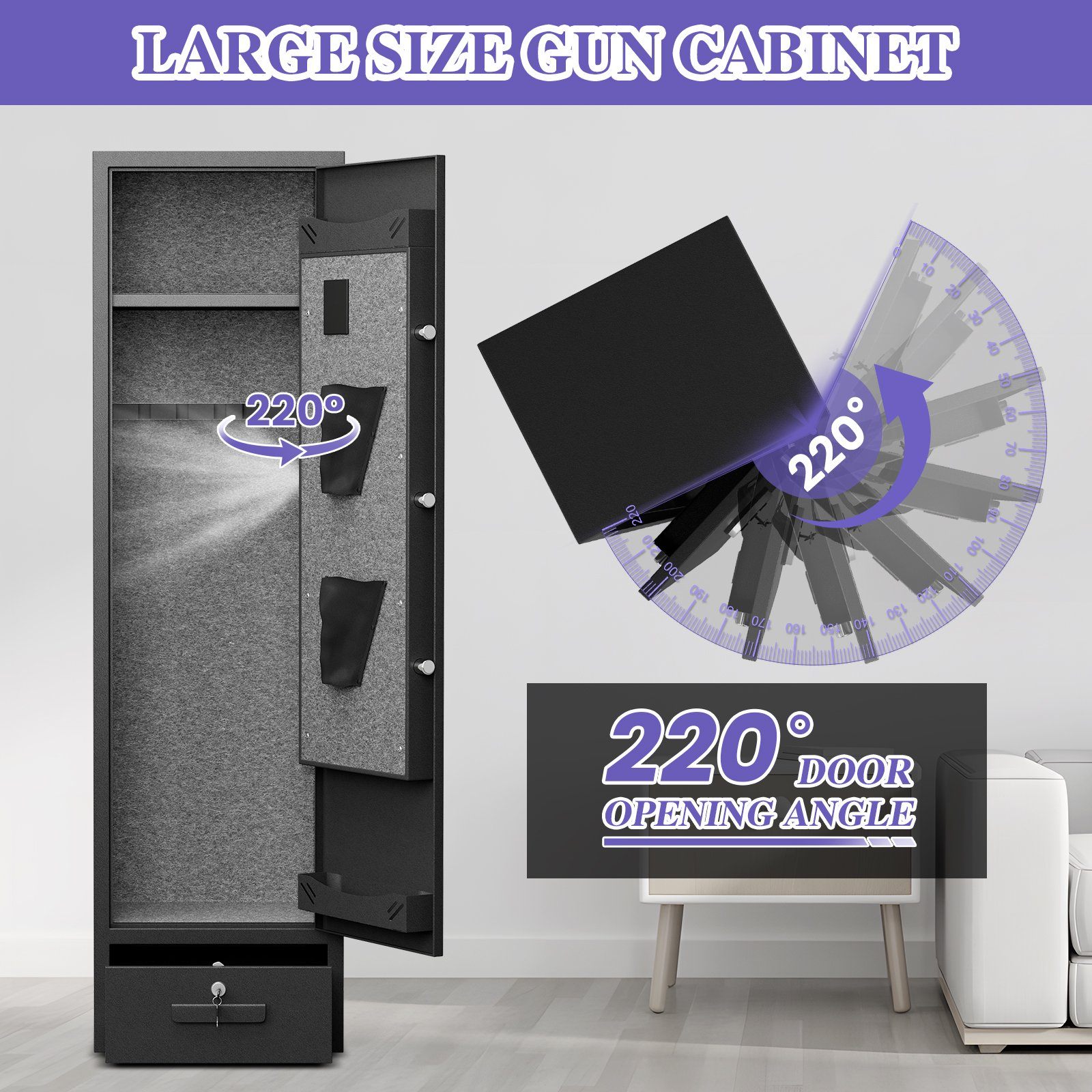 - 【Adjustable Rifle Pistol Rack & More Storage Space】The gun safe has 1 rifle rack and 2 pistol racks. You can adjust the gun mount according to the length of the gun. 2 storage boxes and 2 pistol pockets have been added to the door to store items such as pistols, bullets and bullets. The 220° door opening angle allows you to pick up the gun faster and easier.