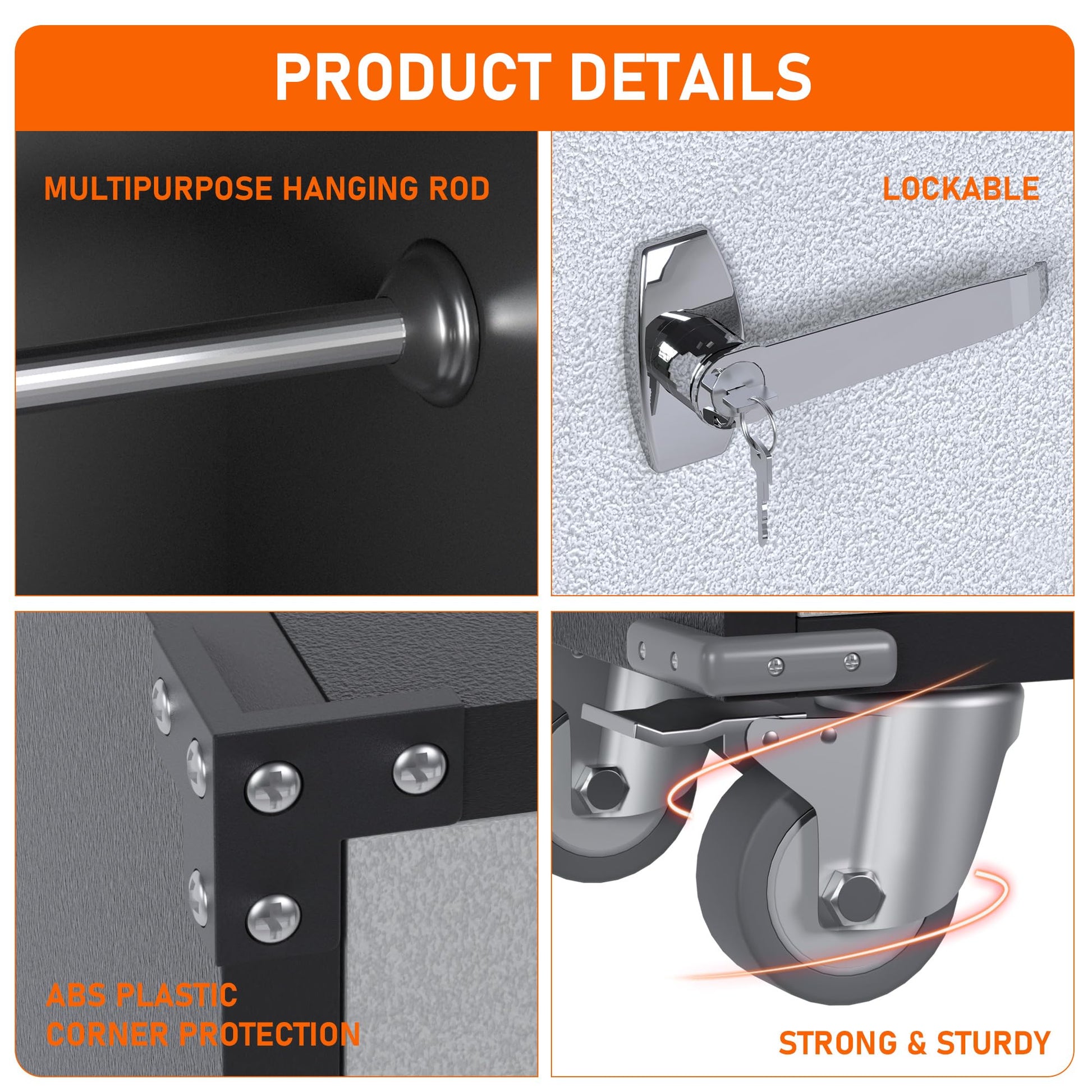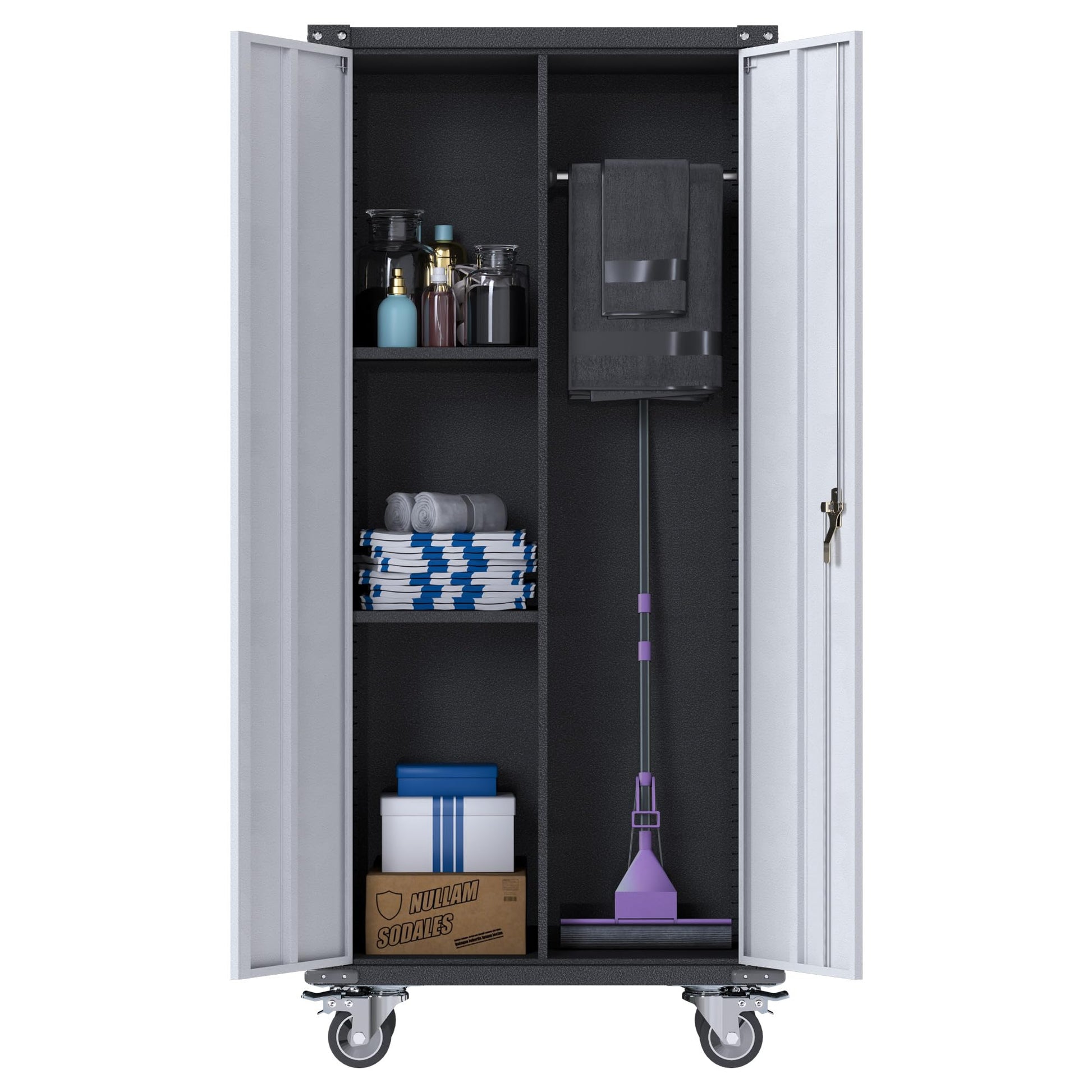 - 【Cabinet with hanging rod】Cabinet interior with hanging rods and adjustable shelves with rods to hang tools or clothes. This cabinet is perfect for garage storage of cleaning tools or as an office closet.