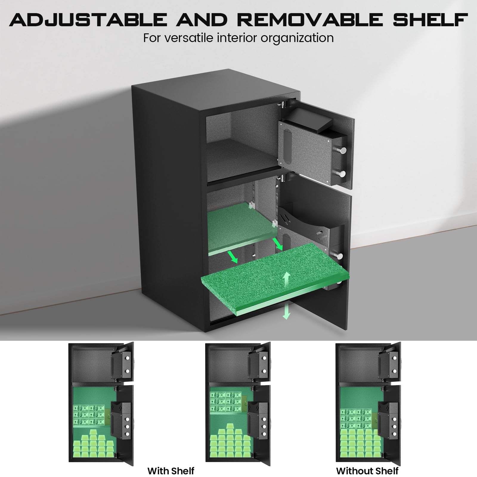 - 【Smart Coin Slot & Metal Compartment】Thoughtful design on the large drop safe box! Deposit cash/coins via the slot without opening the door. The metal compartment stores ammo, and small items. Removable shelf let you adjust space for flexible organization. Soft, scratch-resistant grey velvet lining protects your valuables inside.