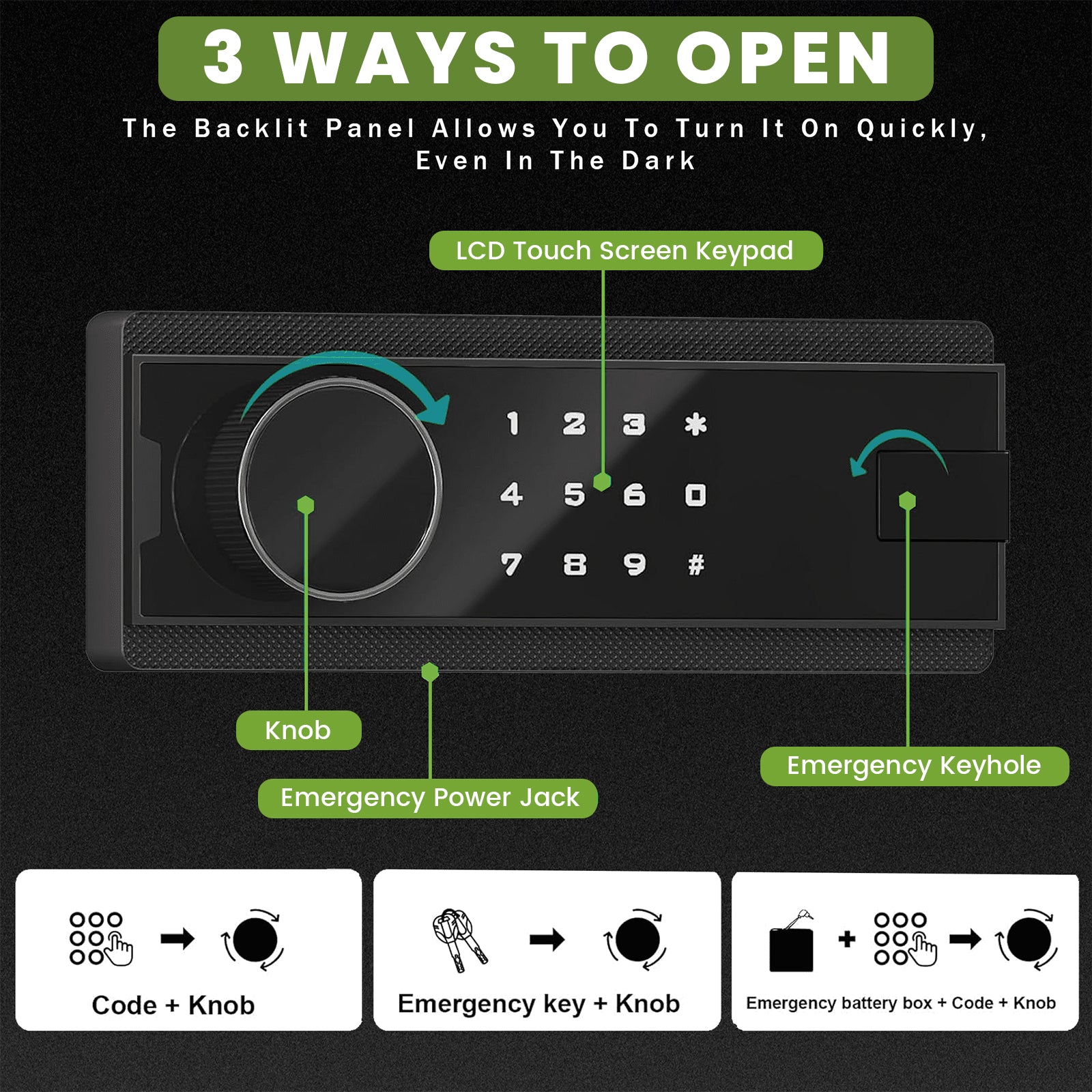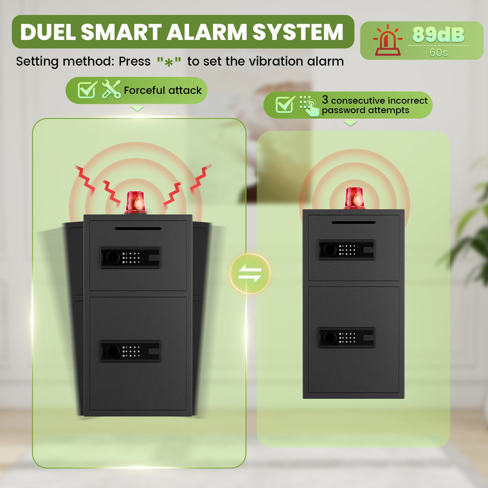 - [Dual Anti-Theft Alarm System & Silent Function]The safe is integrated with an intelligent alarm system. A 70-decibel loud alarm will be activated immediately if three consecutive incorrect passcodes are entered or the safe suffers violent impact, providing timely warning of abnormal situations. After the alarm is triggered, enter the correct passcode to unlock and cancel the alarm. The mute function can be activated with one click to turn off all keypad sounds and alarm tones, ensuring quiet protection without disturbance.