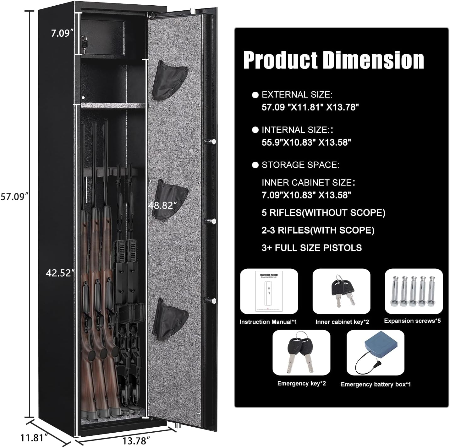 【HIGH AND LARGE CAPACITY】 Larger and deeper rifle gun safe than similar gun safe, can hold 3 handguns and almost 5 rifles up to 50 inches long.The all-steel inner cabinet and the pistol pocket on the door can be convenient for you to put the pistol box cartridge box. External Dimensions: H57.09*D11.81*W13.78in.Internal dimensions: H55.91*D10.83*W13.58.Product Weight:80.5 lb.