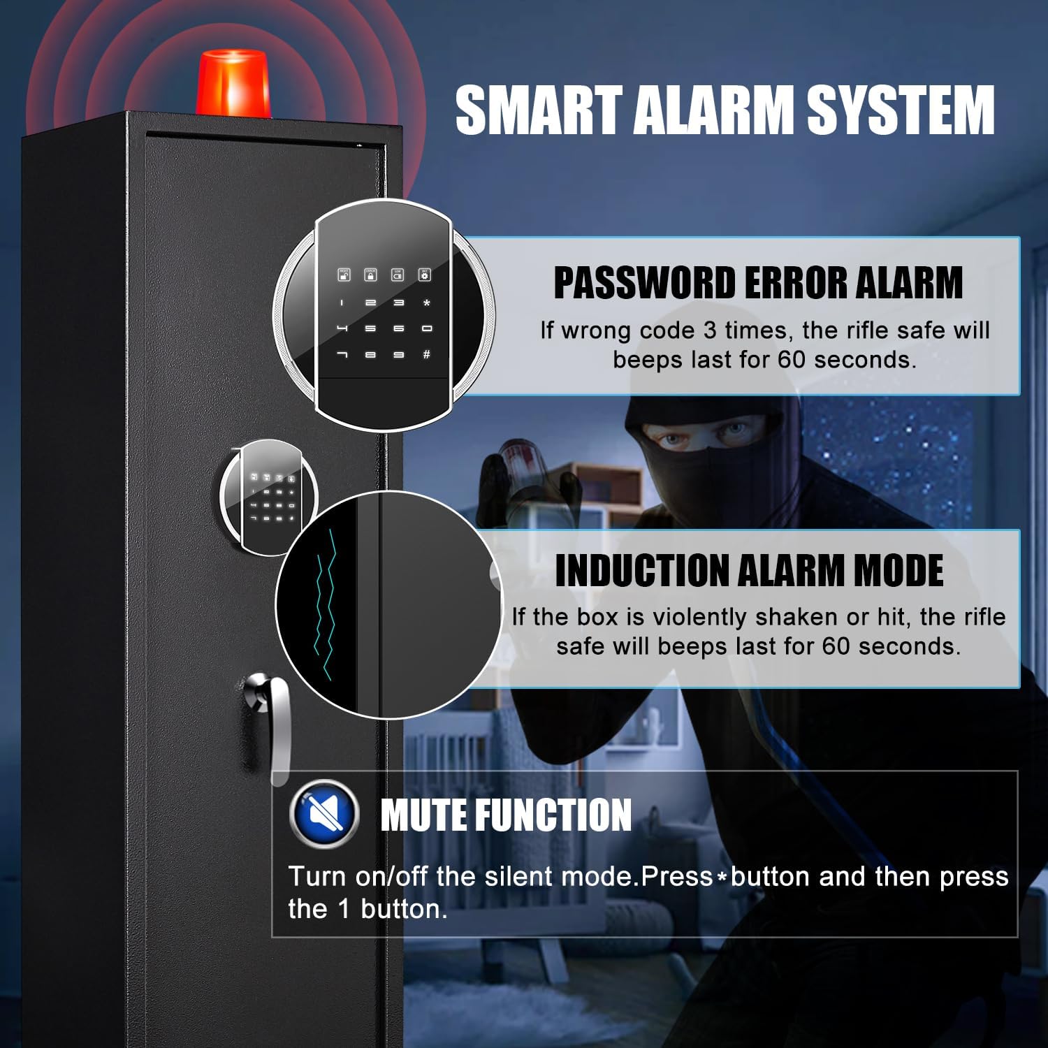【ANTI-TAMPERING ALARM SYSTEM AND MUTE MODE】If the wrong password is inputting three times in a row, the alarm will last for 60 seconds. At the same time, if the home rifle gun safe is moved violently, a vibration alarm will be triggered. During the alarm period, you can enter the password or fingerprint to open the door to cancel the alarm. Unlike other rifles safes, you can turn on mute function if you don't want the safe to make a sound.
