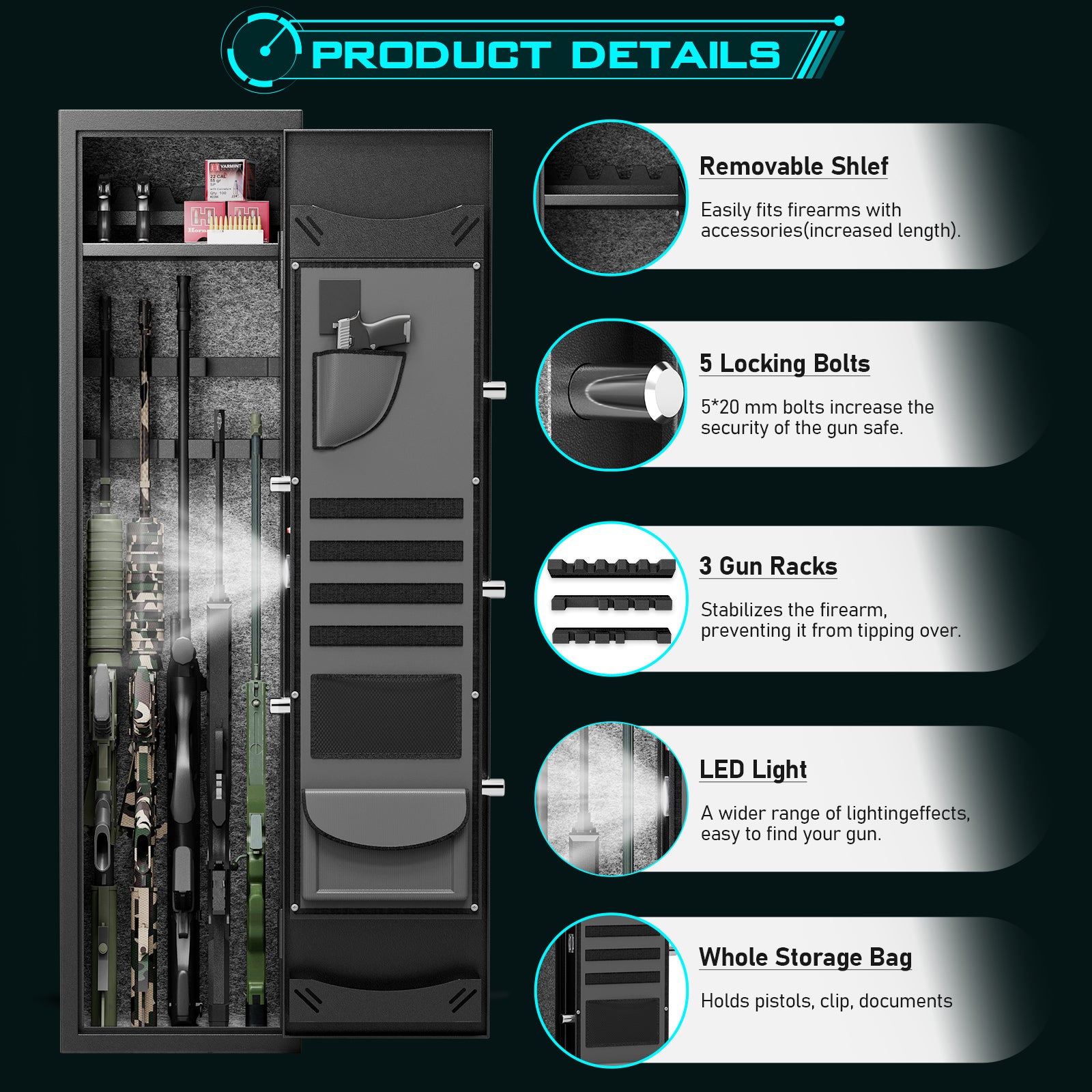 - 【LED LIGHT,ADJUSTABLE RACK】When you open the gun storage cabinet door, the LED lights inside the safe emit a comfortable soft light to help you easily pick the right gun.This biometric gun safe is equipped with 3 adjustable racks.So you can adjust the rack to your needs, depending on the length of your rifle.Fully lined to protect your gun.