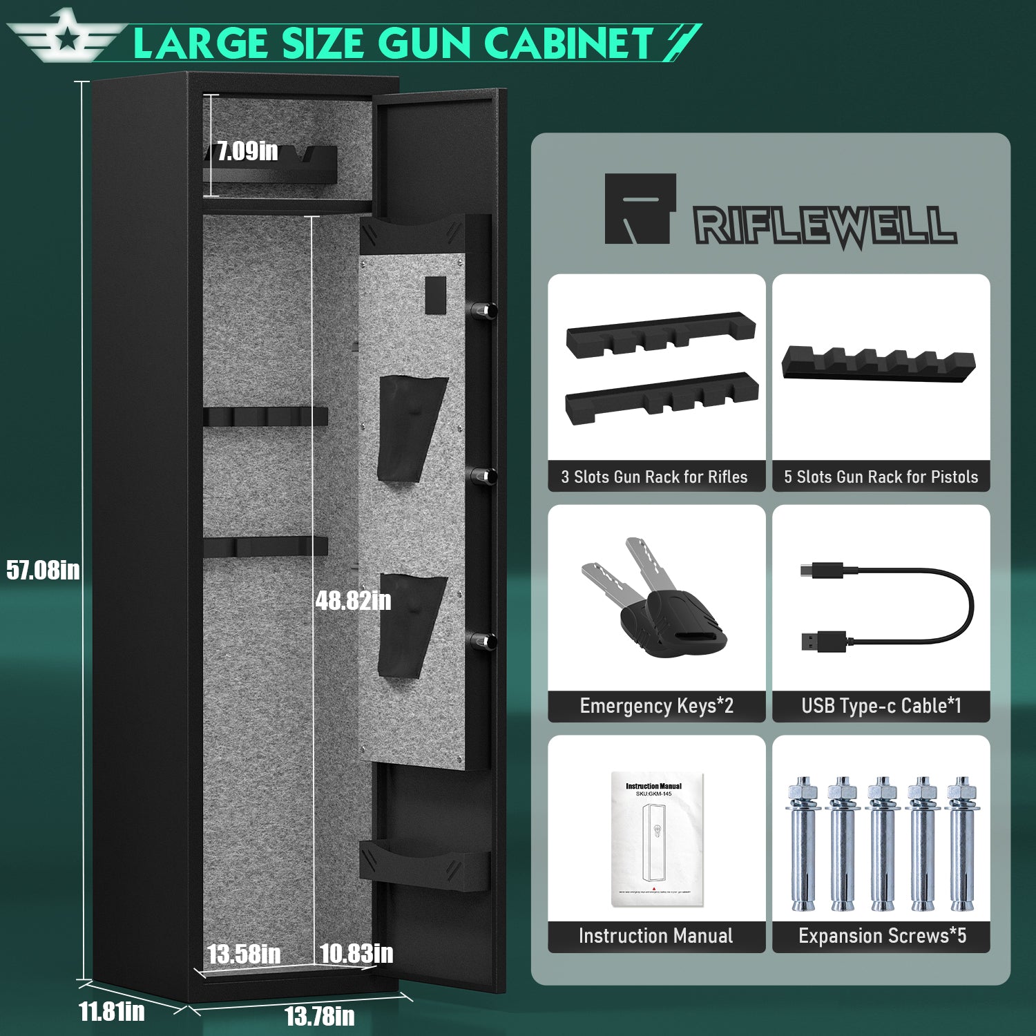 - 【Complete Accessories & Excellent Customer Service】Includes - 1 x Rifle gun safe, 2 x Emergency keys, 2 x Drawer Keys, 5 x Expansion screws, 1 x USB Type-c Cable, 1 x Instruction manual. If there are any problems with the gun cabinet, please tell us directly, our experienced customer service team will respond within 24 hours and solve the problem in your way! If your key is lost and cannot open your safe,we will provide key matching service.