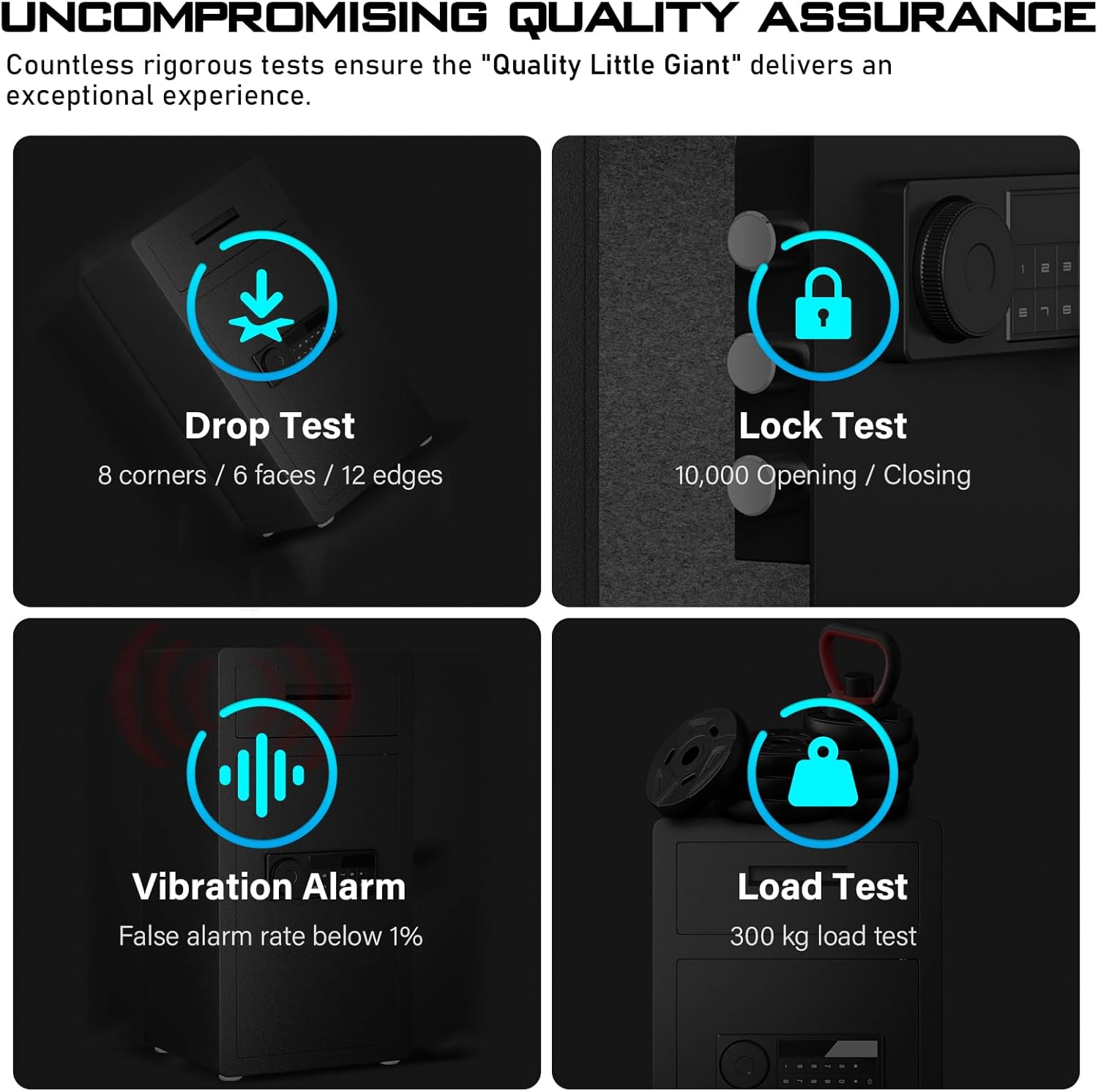 【Latest Upgraded Safe】Trust Kavey to be your vigilant home security guardian.Its intelligent dual alarm system provides two layers of protection: it activates a powerful 70+ decibel alarm if the wrong password is entered five times consecutively or if the safe is tampered with (shaken). Plus, the convenient new silent function ensures quiet access when discretion is key.
