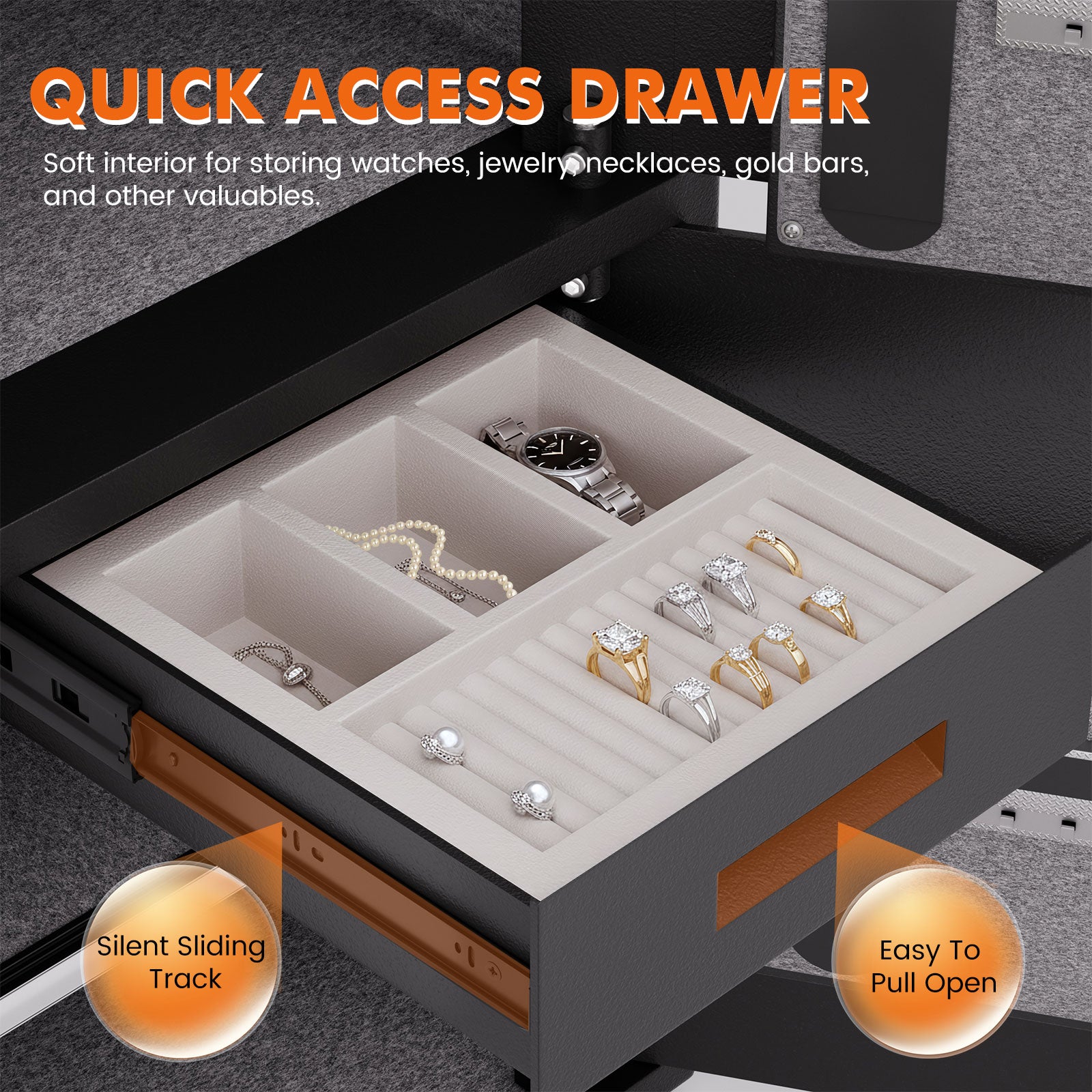 [Sliding Drawer & Jewelry Storage] The safe features a dedicated drawer compartment designed specifically for jewelry. You can store rings, watches, necklaces, bracelets, and other accessories, as well as bank cards. Silent-glide track design ensures smoother operation with minimal noise when opening. The soft interior lining ensures your items remain protected from scratches and damage.