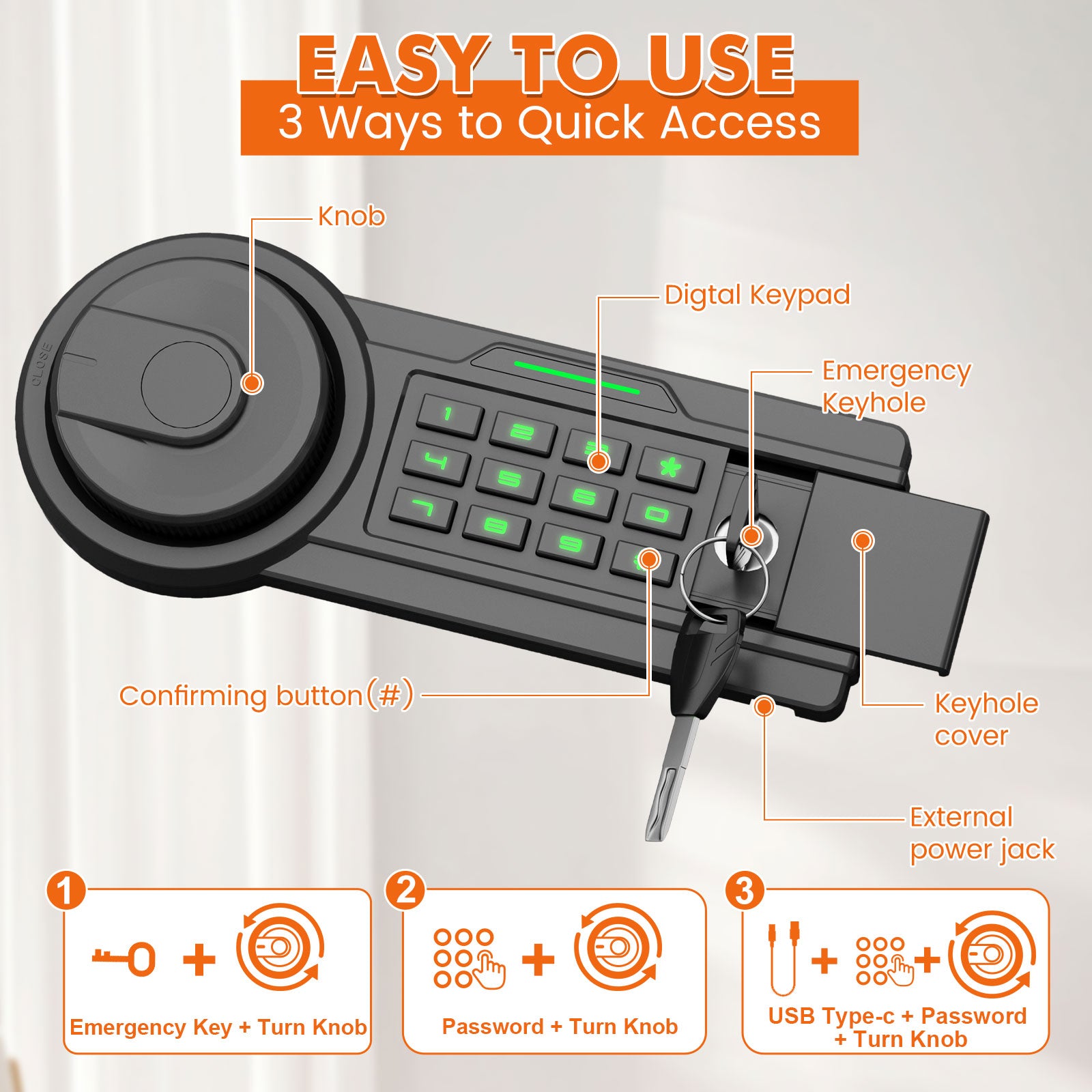 [Three Ways To Open The Door] ①The first way to open: Use the emergency key. Insert the emergency key into the right keyhole, turn counterclockwise to the limit and hold still, then rotate the knob clockwise to open the safe. ②The second way to open: Use the code. After installing the battery, enter your code and then press the # key to confirm, rotate the knob clockwise to open the safe.③The third way to open: Use the USB type-c cable + code.