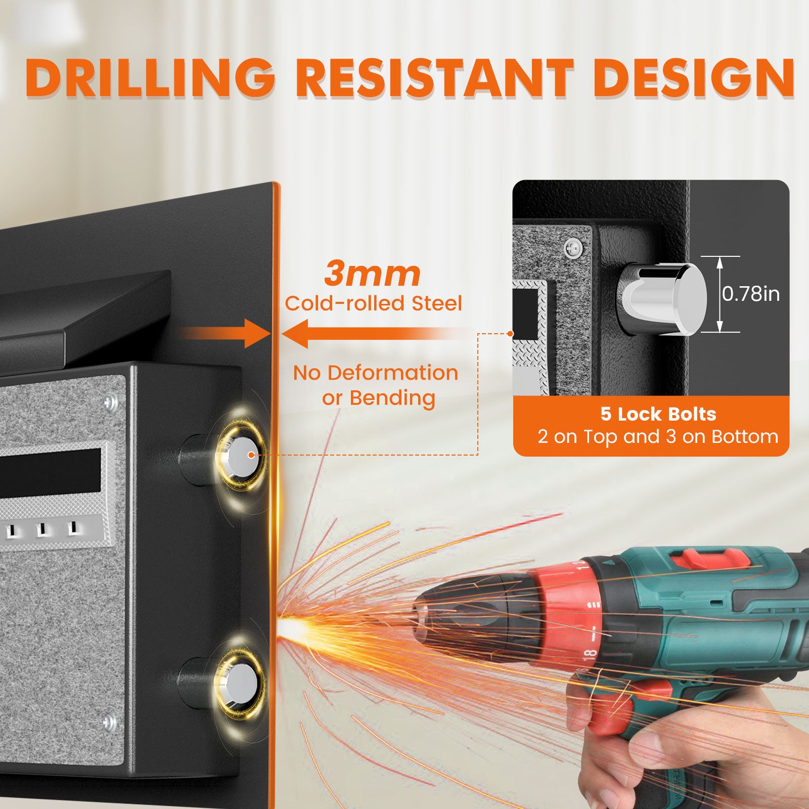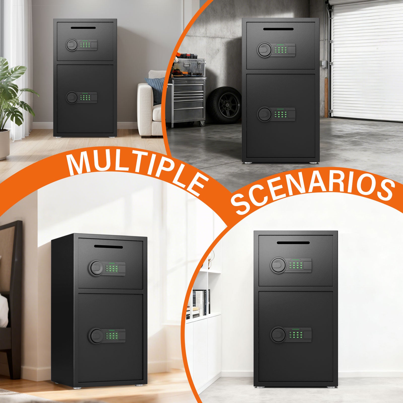 [Heavy Drop Slot Safe] The safe features a coin slot for quick storage of documents, receipts, or bills. Additionally, The drop safe for business is constructed with low-carbon alloy steel, equipped with 5*20mm solid locking bolts and a 60mm thick reinforced steel door panel, as well as an advanced micro-gap cutting design to ensure seamless integration and superior anti-prying protection.This is the optimal choice to safeguard your valuable belongings from theft.