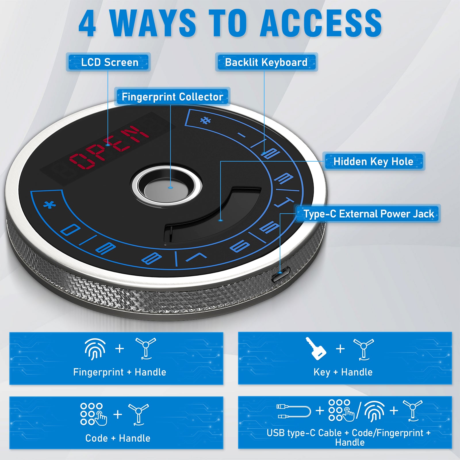 【Four Unlocking Methods】Four ways to open safe: ① Fingerprint + Knob (daily use) ② Password + Knob (daily use) ③ Key + Knob (forget the password) ④ USB type-c + Password + Knob (battery runs out). Please keep the keys and USB type in a secure place, do not lock them inside the safe, it can open the cabinet when it is out of power or if you forget your password.