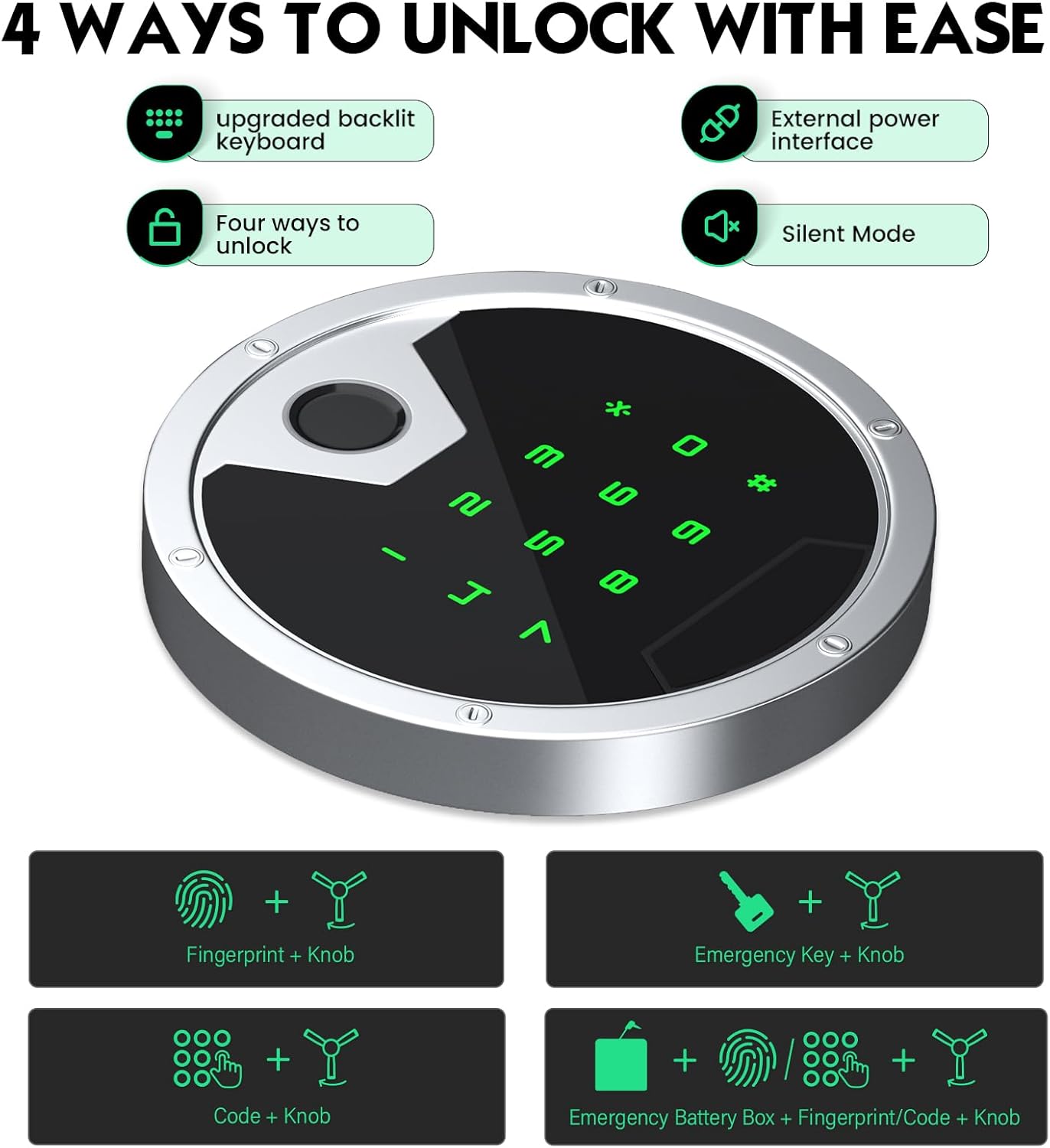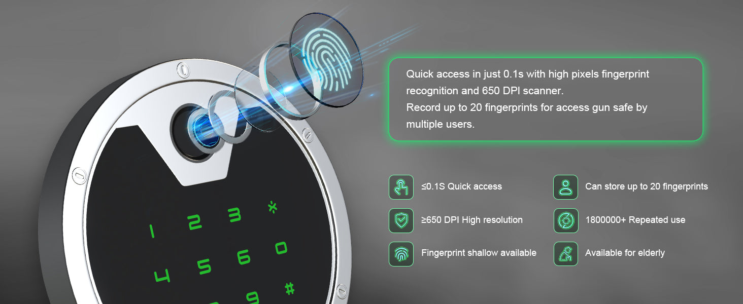 【Quick Access Biometric Gun Safe for Home】Step into the future of safe access with our fingerprint gun safe featuring the latest upgraded biometric technology. A high-resolution DPI scanner unlocks the safe in just 0.1 seconds, offering unparalleled speed and accuracy. Supports up to 20 fingerprints, allowing flexible access control for those you trust.