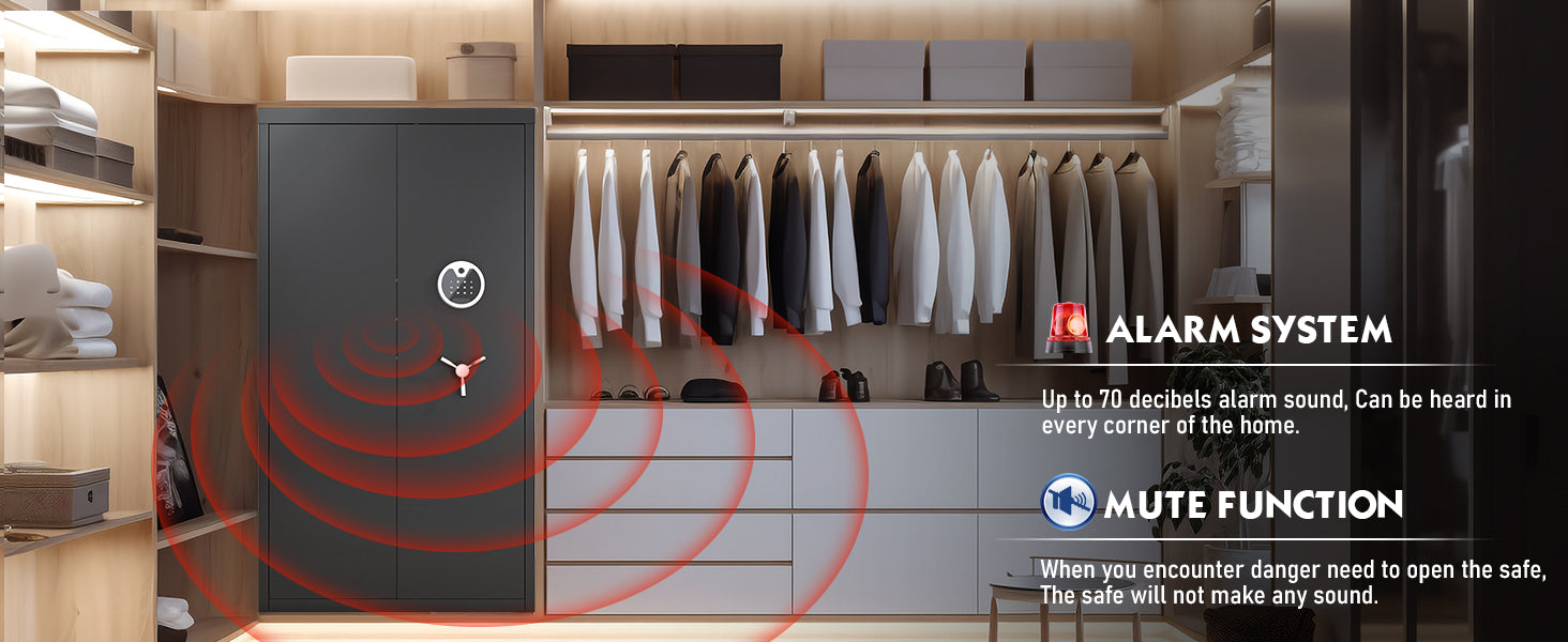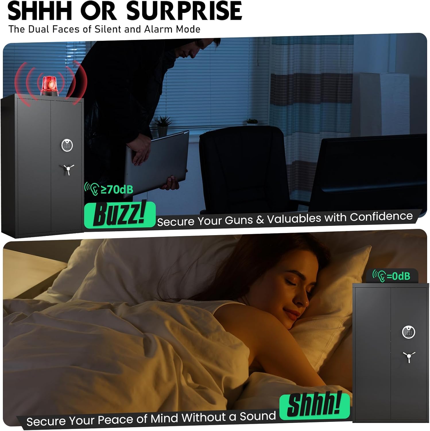 【Upgraded Dual Alarm System, Silent Mode】 This gun safes & cabinets offers upgraded security! The dual alarm system is always on standby: Incorrect password 3 times? Wrong fingerprint 5 times? Shaken or impacted? The alarm triggers instantly! A loud 70dB alarm deters intruders. New silent mode for quiet use. Solid home protection by Luzfuego.