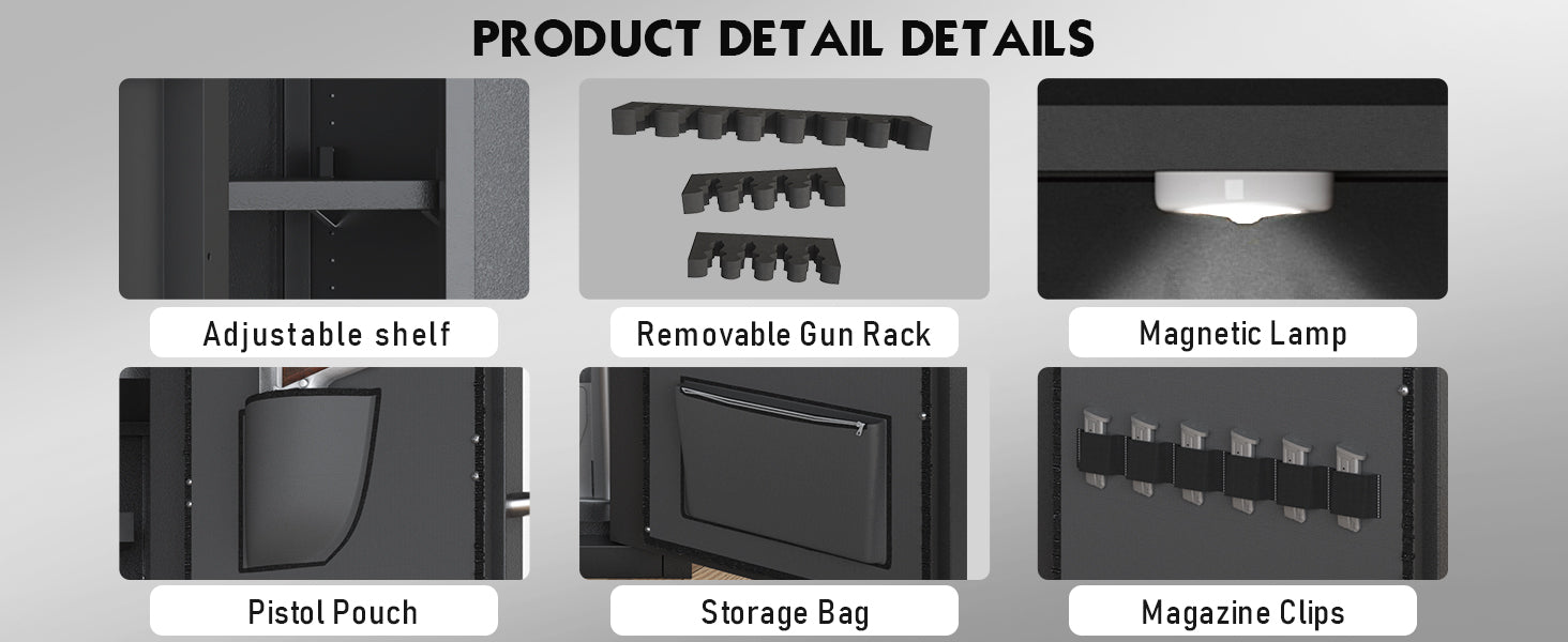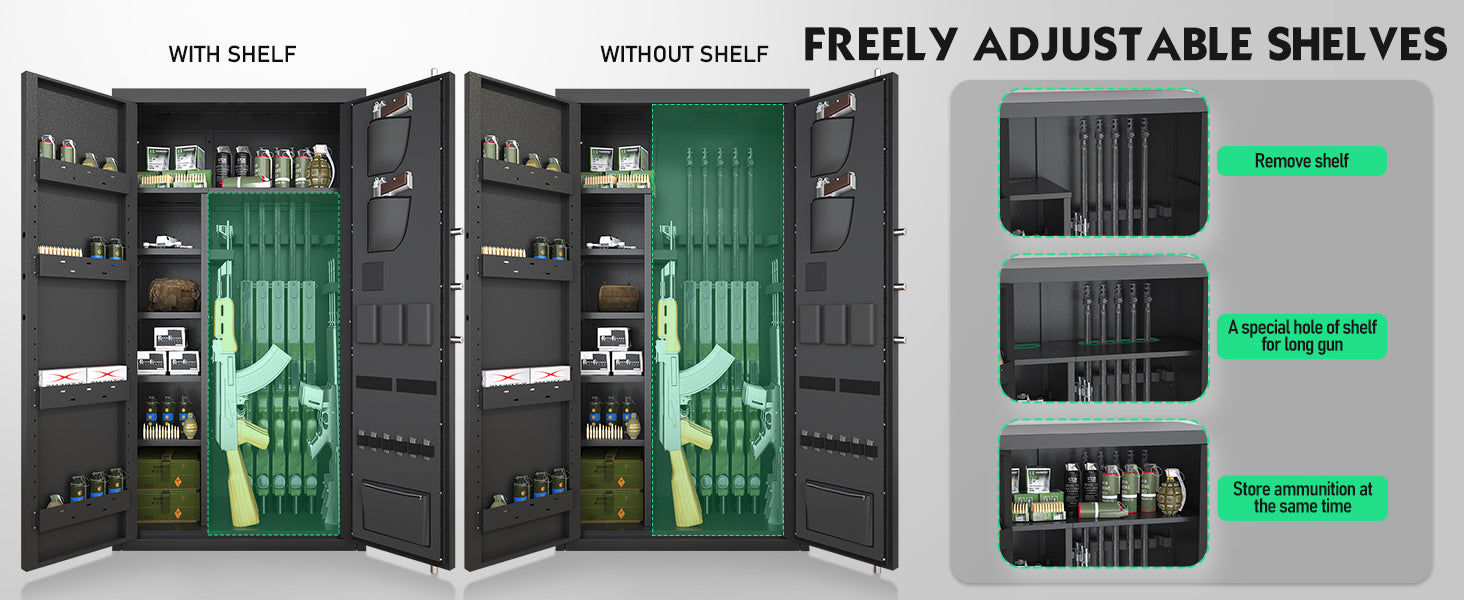 【Multi-functional Gun Cabinet】This large gun cabinet features a clearly organized interior layout. It is specially equipped with 4 freely movable and adjustable shelves on the left side, meeting your personalized storage needs. The inside of the cabinet door also features multi-functional storage compartments for pistols, ammunition and metal storage boxes, allowing you to easily sort and store your firearms and accessories by category.