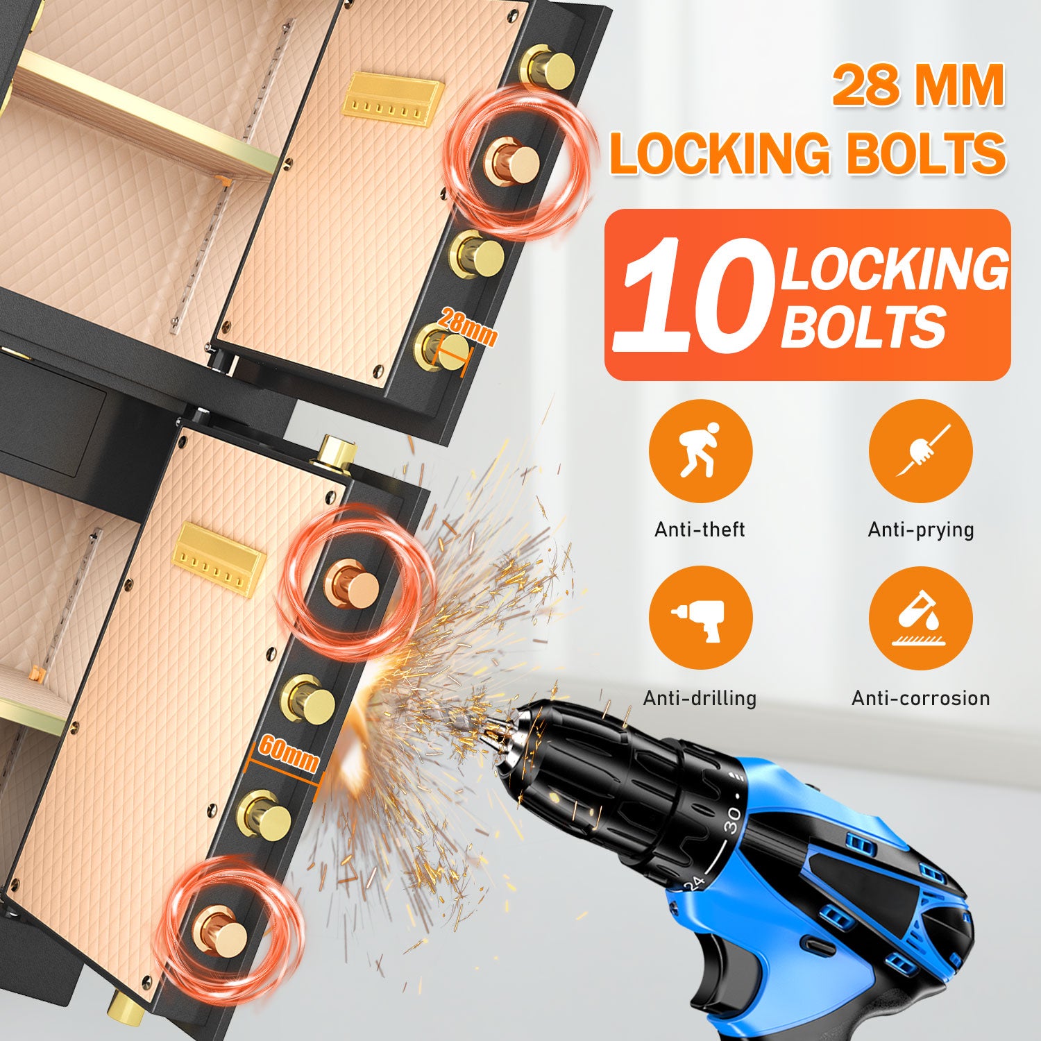 HEAVY DUTY SAFE BOX: This heavy duty extra large safe is crafted from low-carbon alloy steel, boasting excellent resistance to impact, prying, and high temperatures. Equipped with 10 solid 28mm locking bolts, it offers an impressive level of security, making it the perfect choice for protecting your valuable items. Suitable for both residential and commercial settings, provides peace of mind thanks to its superior construction and enhanced protective features.