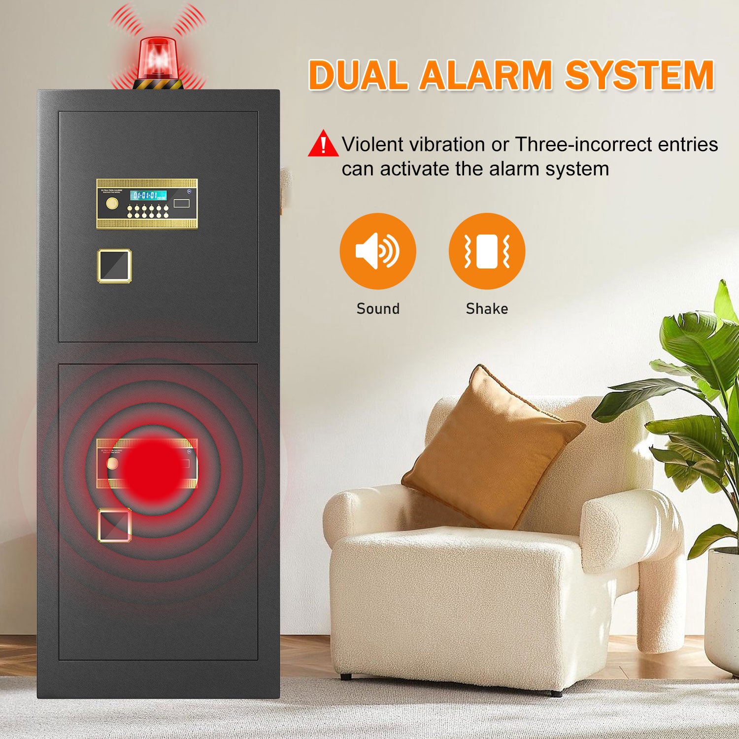 DUAL ALARM SYSTEM: For enhanced security, this home safe is equipped with a dual alarm system featuring both a password error alarm and a vibration alarm. These alarms are triggered by either three consecutive incorrect password attempts or violent vibrations. When activated, the alarm sounds up to 70 decibel, ensuring it can be heard throughout your home, providing immediate notification of potential security breaches.