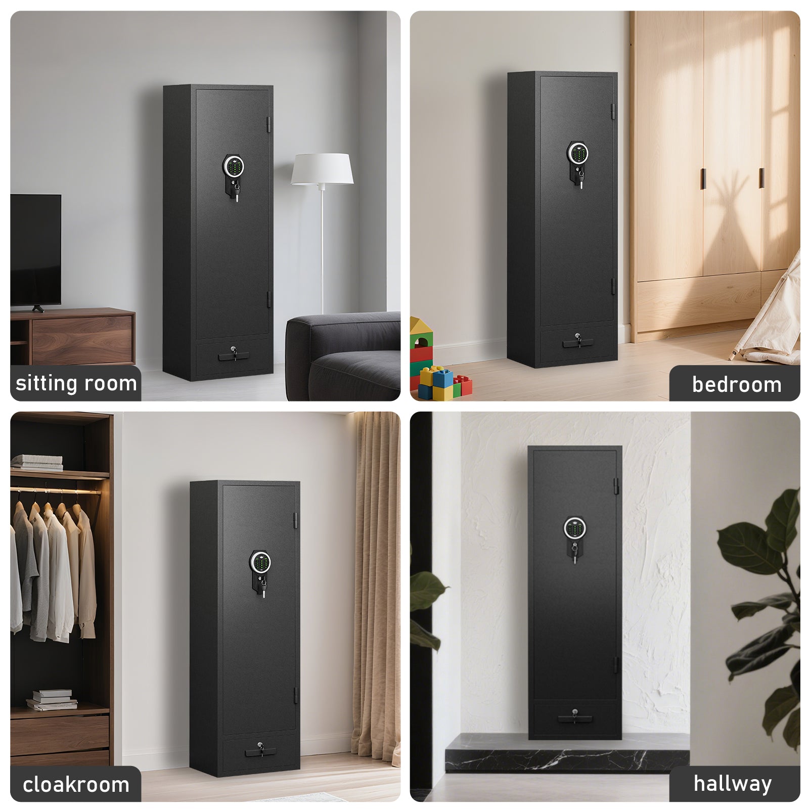 - 【Sturdy Gun Safe with Drawer】Gun safe is made of low carbon alloy steel, which has an excellent anti-drilling, anti-smashing and temperature resistance performance, the scratch & stain resistant powder coat protects the safe box from rust and damage. The lockable drawer at the bottom of the gun safe can store various items according to individual needs, such as cameras, documents,jewelry, bullets and other items.