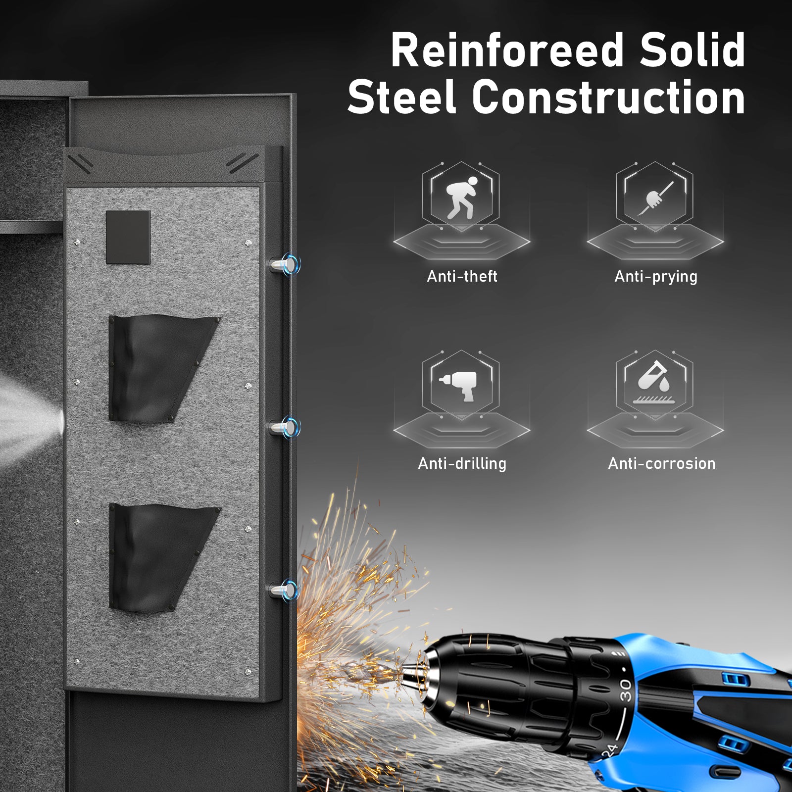 - 【Removable Shelf & Ammo Storage Box】Gun safes for home pistols with removable shelf, adjustable gun racks and pistol bags. You can remove the shelf or adjust the gun rack according to the length of the gun. There are also 2 pistol bags and 2 ammo storage shelf on the door for storing pistols, ammunition, firearm accessories and more.