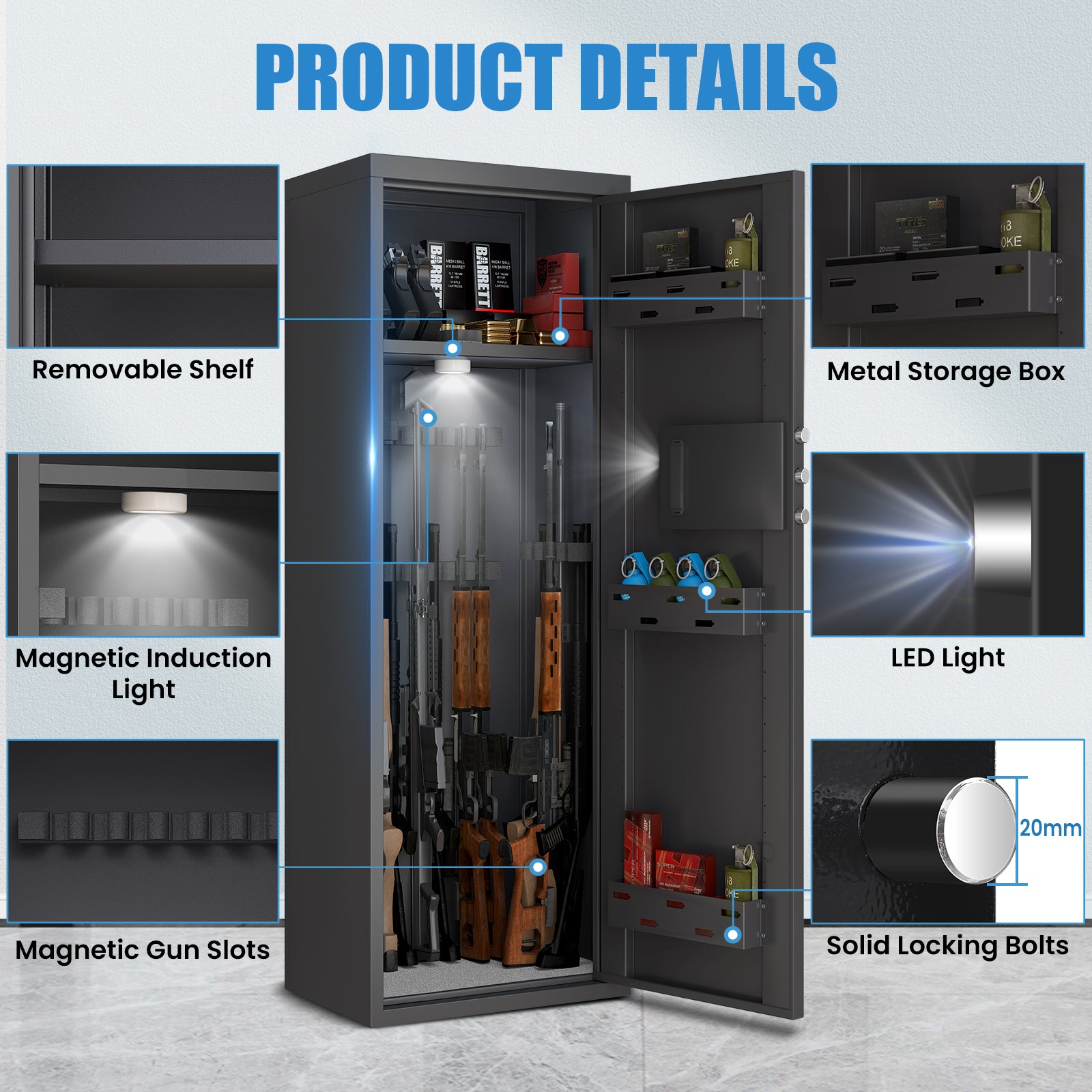 - 【Larger and Deeper Gun Safes for Home Rifle and Pistols】 Exterior Dimensions: 15.35"D x 21.06"W x 51.96"H. Our safe accommodates for up to 10-12 guns.With 3 magnetic gun supporta and a convenient removable shelf, you can remove the shelf as needed. The door has 3 adjustable ammo boxs for storing bullets, money and other valuables.