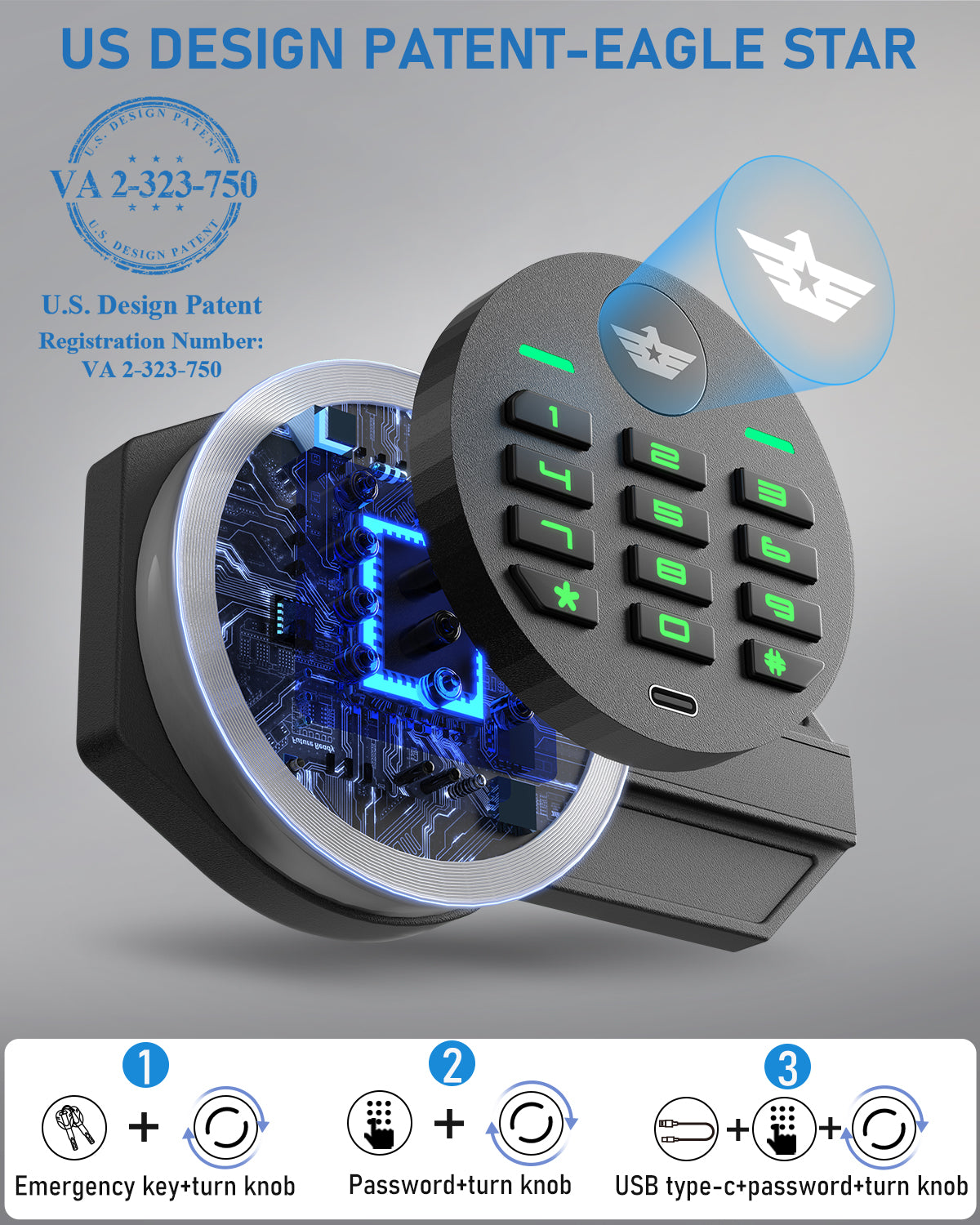- Backlit Keypad: Equipped with a backlit digital keypad with a unique patented "Eagle Star" design for quick unlocking in dark conditions.